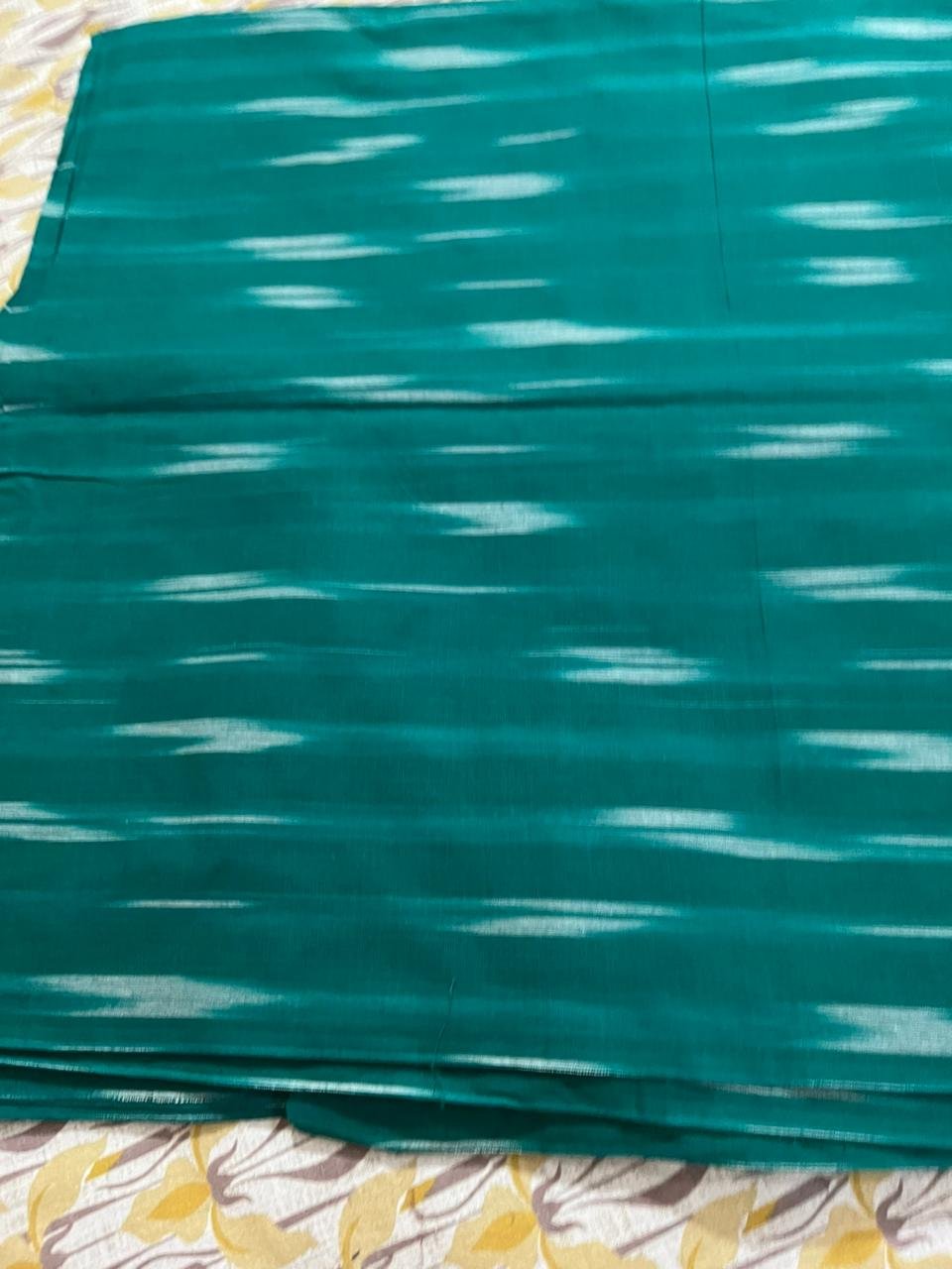 This ikkat cotton fabric is woven using fine cotton yarns with intricate ikkat dyeing techniques. The fabric is breathable, lightweight, and comfortable for all seasons. Suitable for kurtas, tops, dresses, and upholstery crafts.